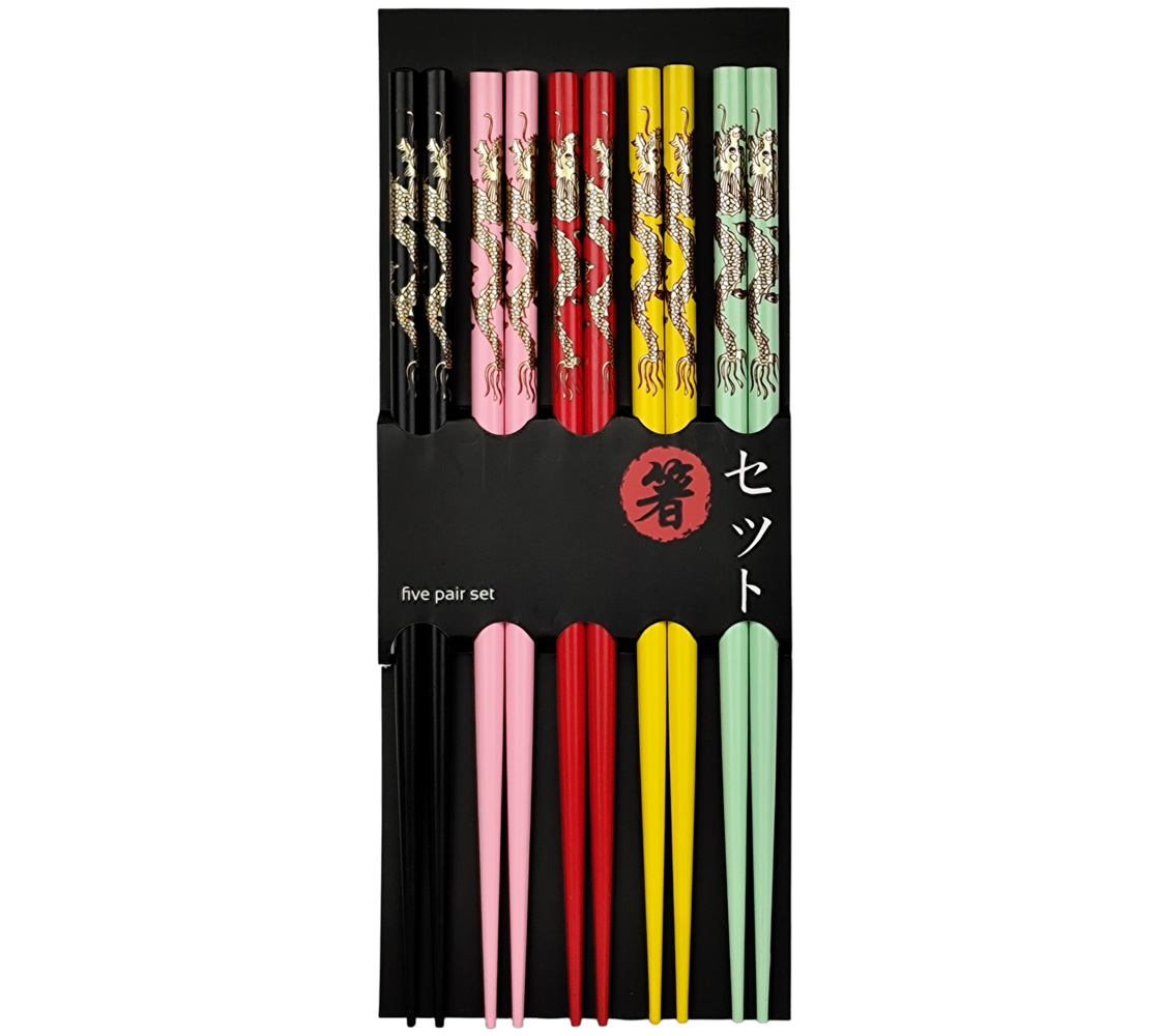 Jedes Paar ist bunt lackiert – in Schwarz, Pink, Rot, Gelb und Mintgrün – und am oberen Schaft mit einem kunstvoll gestalteten Drachen-Motiv in Gold verziert. Ergänzt wird das Design durch feine Details, die das Set zu einem echten Blickfang machen. Die Drachen gelten in der chinesischen Kultur als Sinnbild für Stärke, Glück und Wohlstand.