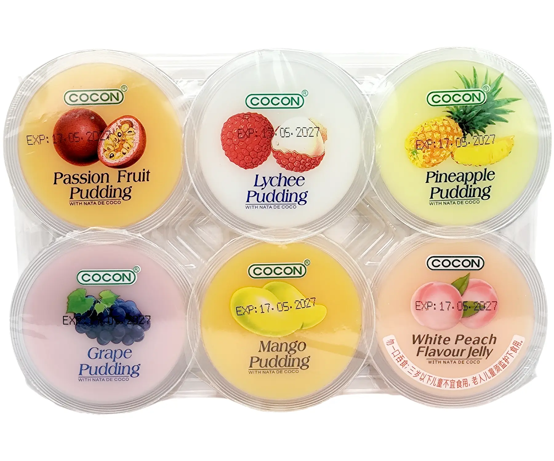 Der Nata de Coco Fruchtpudding Mix von Cocon ist ein fruchtiges Dessert mit weichen Kokosnussstückchen und verschiedenen exotischen Geschmacksrichtungen. Die Kombination aus fruchtigem Gelee und zarten Nata-de-Coco-Stückchen sorgt für eine besondere, leicht elastische Textur und ein erfrischendes Geschmackserlebnis.