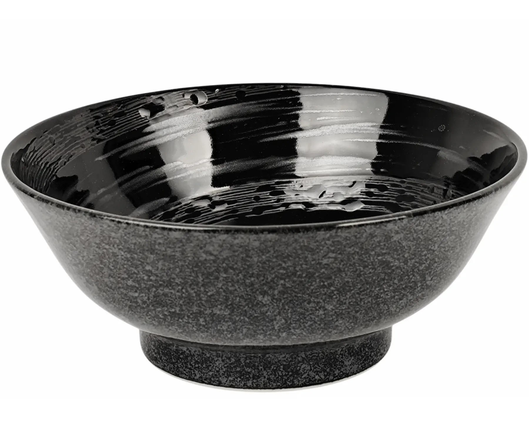 Die Ramen Bowl „Ara-Uzu“ vereint modernes Design mit traditioneller japanischer Formgebung. Innen präsentiert sie sich in hochglänzendem Schwarz, veredelt mit einem matten silber-grauen Wirbelmuster, das dezent eingeprägt ist und an fließendes Wasser erinnert. Außen überzeugt die Schale mit einer schwarz-grau gesprenkelten Oberfläche, die ihr eine edle, handwerkliche Optik verleiht.